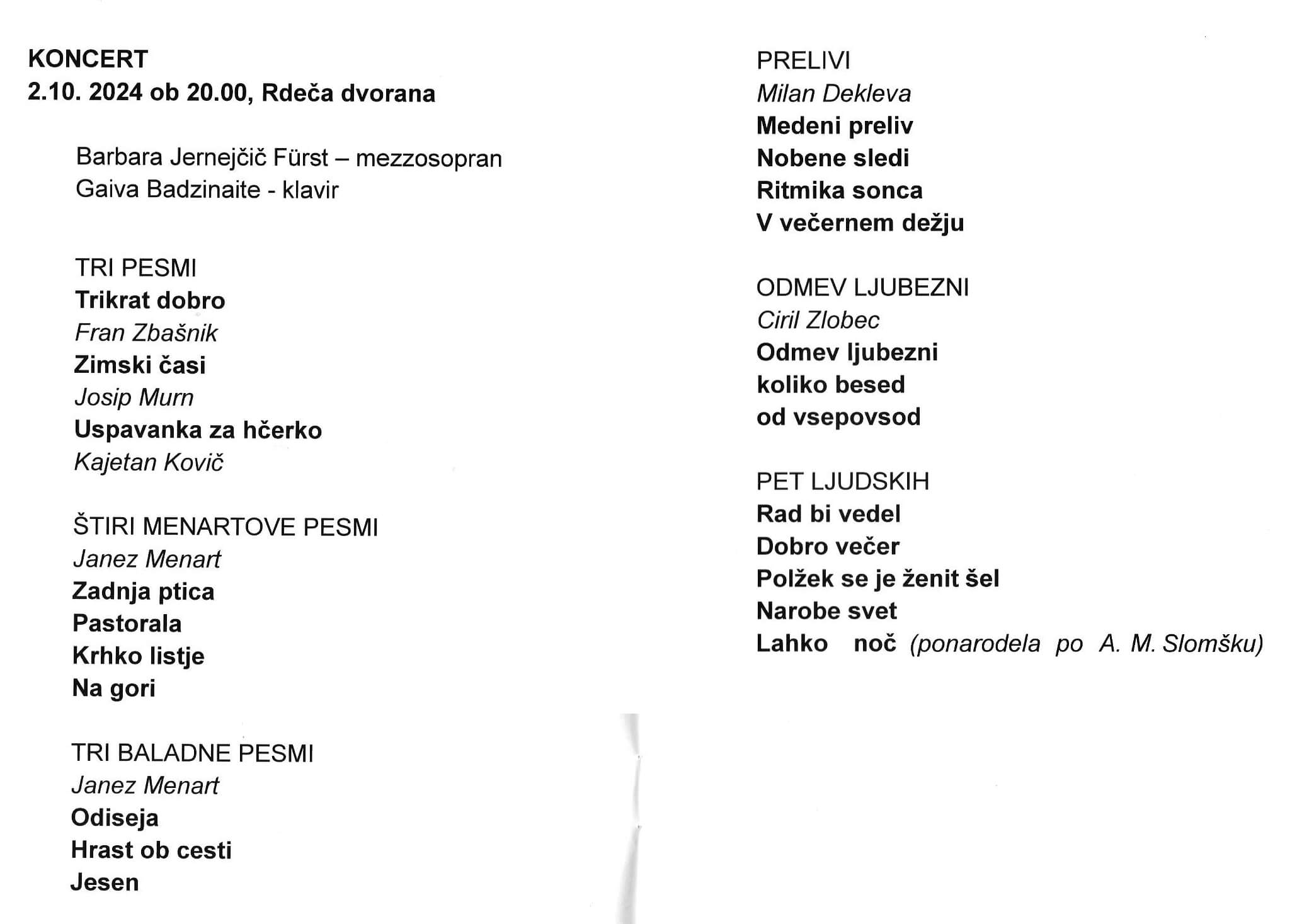 KONCERTU OB ROB: Redki so koncerti samospevov v Sloveniji in še redkejši celovečerni koncerti samo enega solopevca/solopevke s spremljavo klavirja. Totalno redkejši pa še koncerti slovenskega samospeva v celoti. Vse to se je "pokrilo" to sredo s koncertom samospevov Jakoba Ježa. In izvedenih 6 (šest) ciklov Ježevih samospevov, 22 samospevov. Prepohvalno.