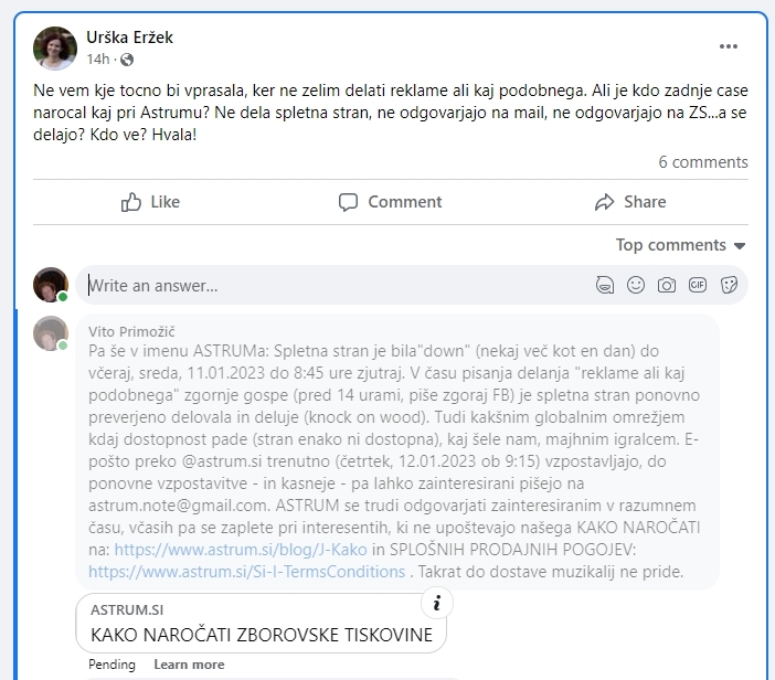 "Pa še v imenu ASTRUMa: Spletna stran je bila"down" (nekaj več kot en dan) do včeraj, sreda, 11.01.2023 do 8:45 ure zjutraj. V času pisanja delanja "reklame ali kaj podobnega" zgornje gospe (pred 14 urami, piše zgoraj FB) je spletna stran ponovno preverjeno delovala in deluje (knock on wood). Tudi kakšnim globalnim omrežjem kdaj dostopnost pade (stran enako ni dostopna), kaj šele nam, majhnim igralcem. E-pošto preko @astrum.si trenutno (četrtek, 12.01.2023 ob 9:15) vzpostavljajo, do ponovne vzpostavitve - in kasneje - pa lahko zainteresirani pišejo na astrum.note@gmail.com. ASTRUM se trudi odgovarjati zainteresiranim v razumnem času, včasih pa se zaplete pri interesentih, ki ne upoštevajo našega KAKO NAROČATI na: https://www.astrum.si/blog/J-Kako in SPLOŠNIH PRODAJNIH POGOJEV: https://www.astrum.si/Si-I-TermsConditions . Takrat do dostave muzikalij ne pride."