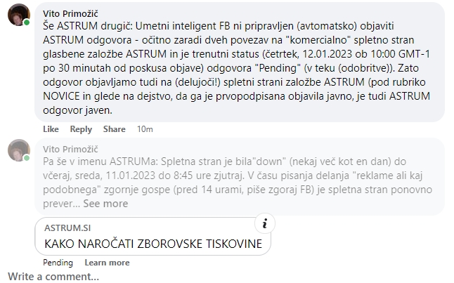 Umetni inteligent FB ni pripravljen (avtomatsko) objaviti ASTRUM odgovora - očitno zaradi dveh povezav na "komercialno" spletno stran glasbene založbe ASTRUM in je trenutni status (četrtek, 12.01.2023 ob 10:00 GMT-1 po 30 minutah od poskusa objave) odgovora "Pending" (v teku (odobritve)). Zato odgovor objavljamo tudi tule in glede na dejstvo, da ga je prvopodpisana objavila javno, je tudi ASTRUM odgovor javen: