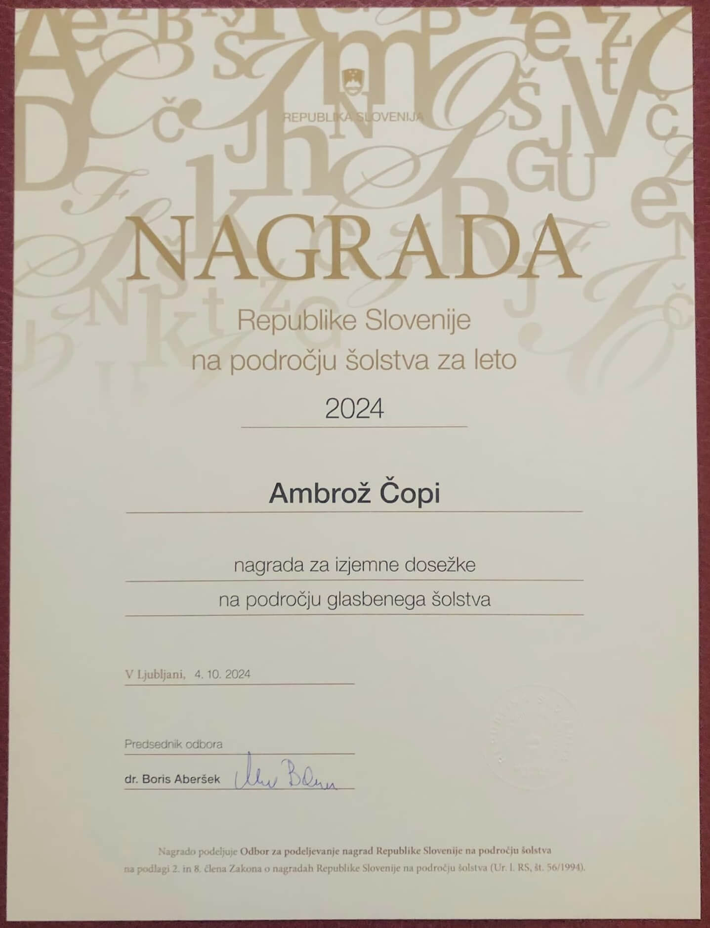 Nagrada Republike Slovenije za izjemne dosežke na področju glasbenega šolstva 2024 & Ambrož ČOPI